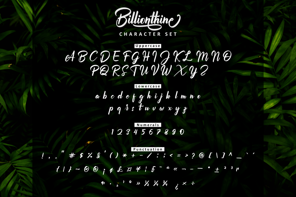 Billionthine is a bold and strong script font. carefully crafted with calligraphy. that contains many stylistic alternate and swashes that will help you to create your own customized design.