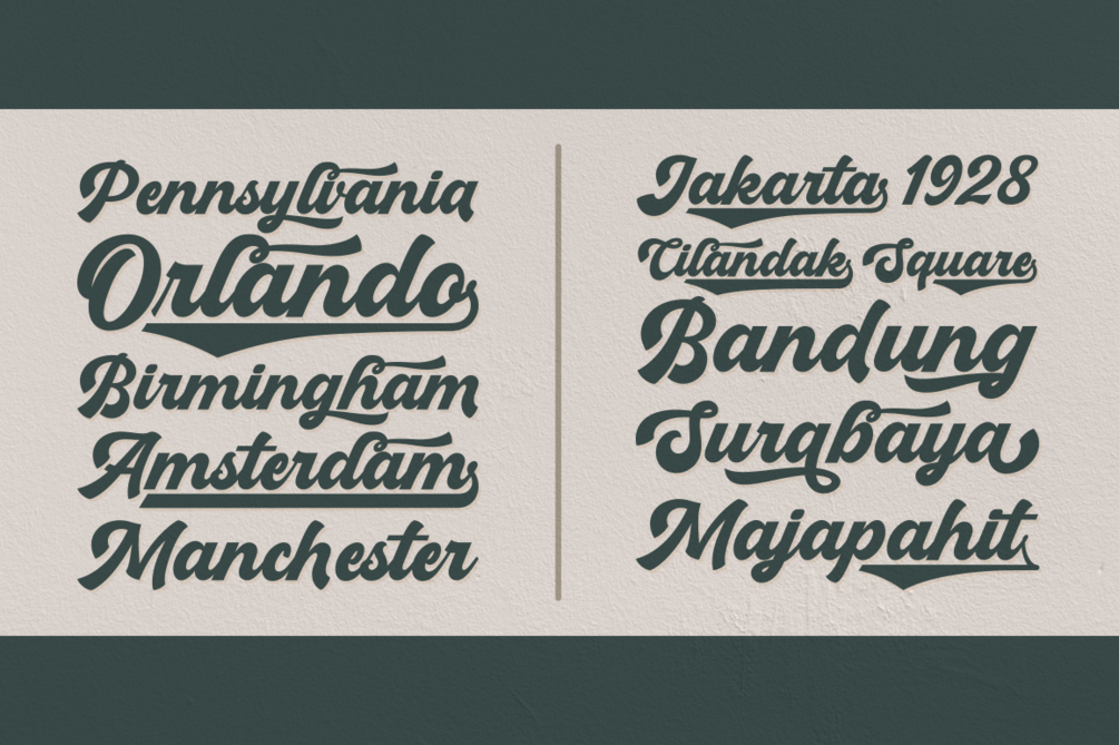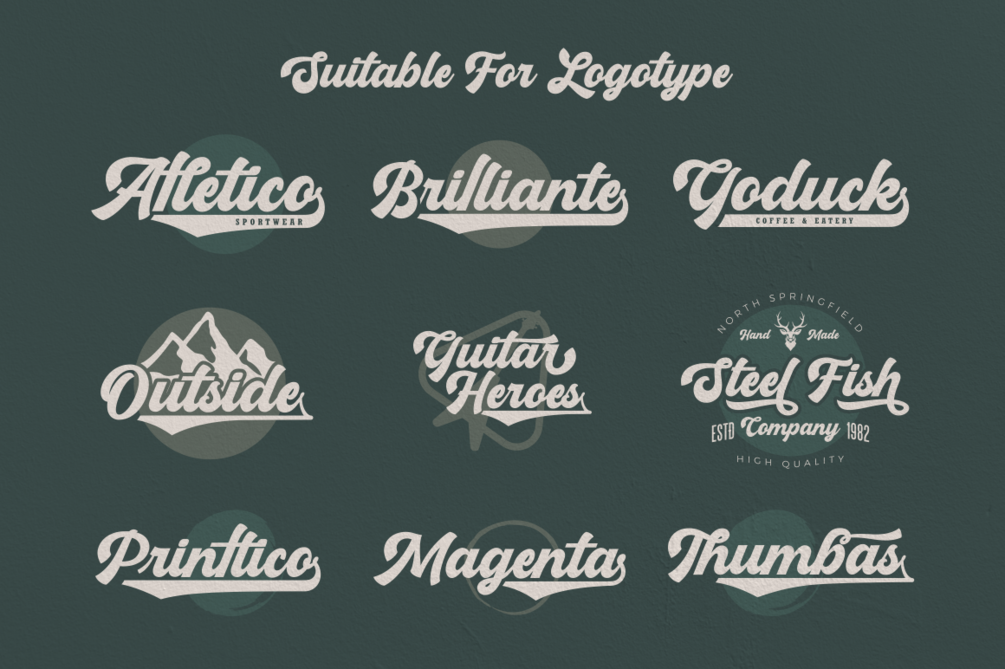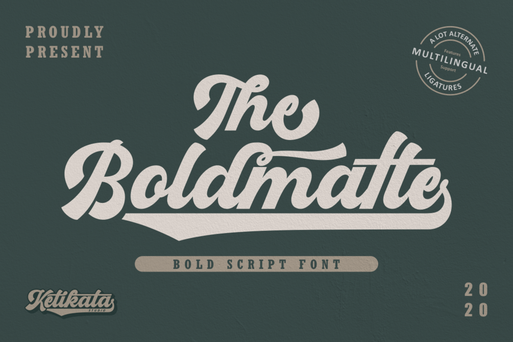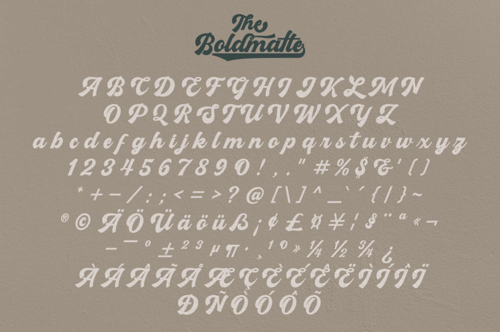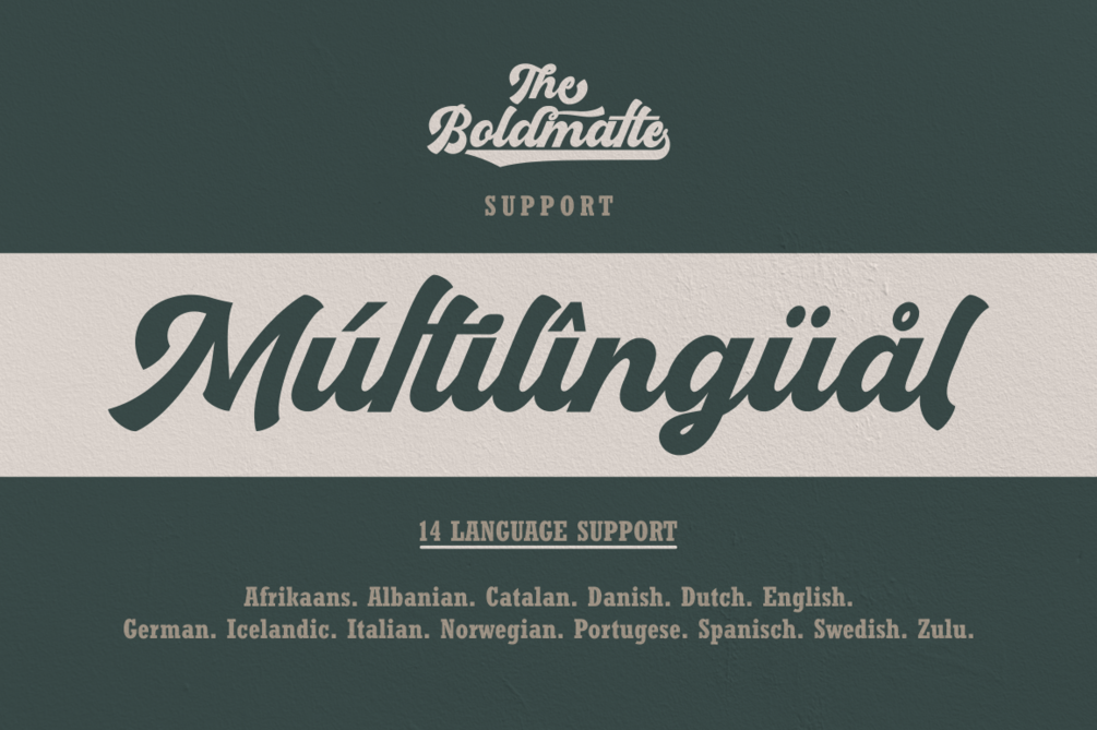 Boldmatte has lots of alternate characters, swashes and 50 ligatures. It has also a bunch of tails with different shapes and widths to give the vintage logotype or sports look to your design.
